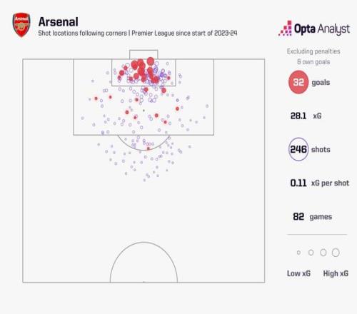 在这段时间里,阿森纳通过角球打进32球 (这里不包括乌龙球,因为它们不计入预期进球xG),对应28.1的xG。