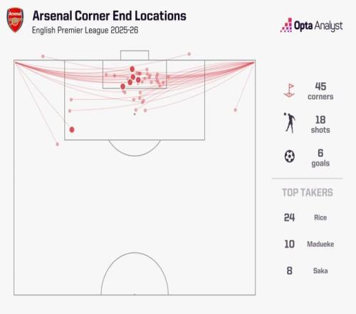 Opta揭秘阿森纳角球:前后点均衡落位,49%角球直袭球门中路