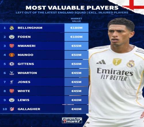 落选新一期英格兰大名单球员身价榜:贝林厄姆居首、福登第二