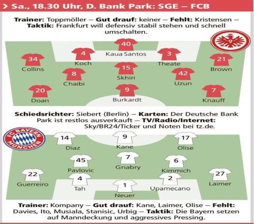 雷速体育10月4日宣 北京时间10月5日00:30,德甲第6轮,法兰克福坐镇主场迎战德甲领头羊拜仁慕尼黑,本场比赛开始之前,德国媒体《慕尼黑日报》预测了双方的首发阵容,拜仁慕尼黑由目前脚感火热的凯恩领衔,法兰克福方面会继续首发连场进球的土耳其小将詹·乌尊。
