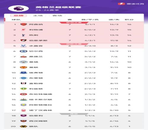 英超积分榜:阿森纳取胜反超登顶,利物浦连败滑落第二